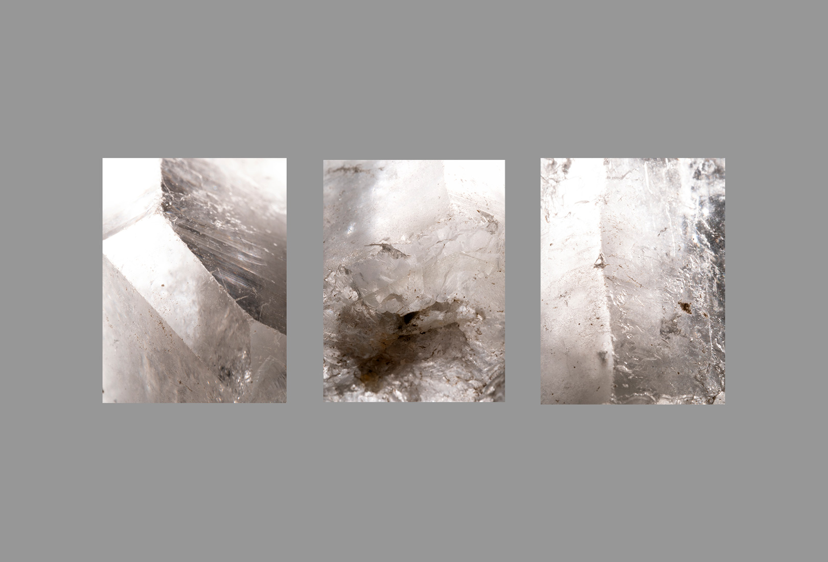 On a summer's day in 1991, in the sea near where Whelan grew up, a young scuba diver disappeared during a dive. A search took place involving the whole neighbourhood, but the diver's body was found days later, caught up in illegal fishing nets. In an attempt to connect with any biological or metaphysical traces of this event, Whelan placed quartz crystals among the rocks and seaweed at this site. For a full moon cycle, the crystals became part of this environment, submerged under the violent waves. They were then collected without any human touch, so as not to affect the surface and the potential trauma absorbed within. The crystals were photographed using extreme macro photography, investigating the edges, surfaces and the algae attached. Afterwards, the crystals were returned to the sea. The height of the prints corresponds to the average height of a person in the country where the work is exhibited.