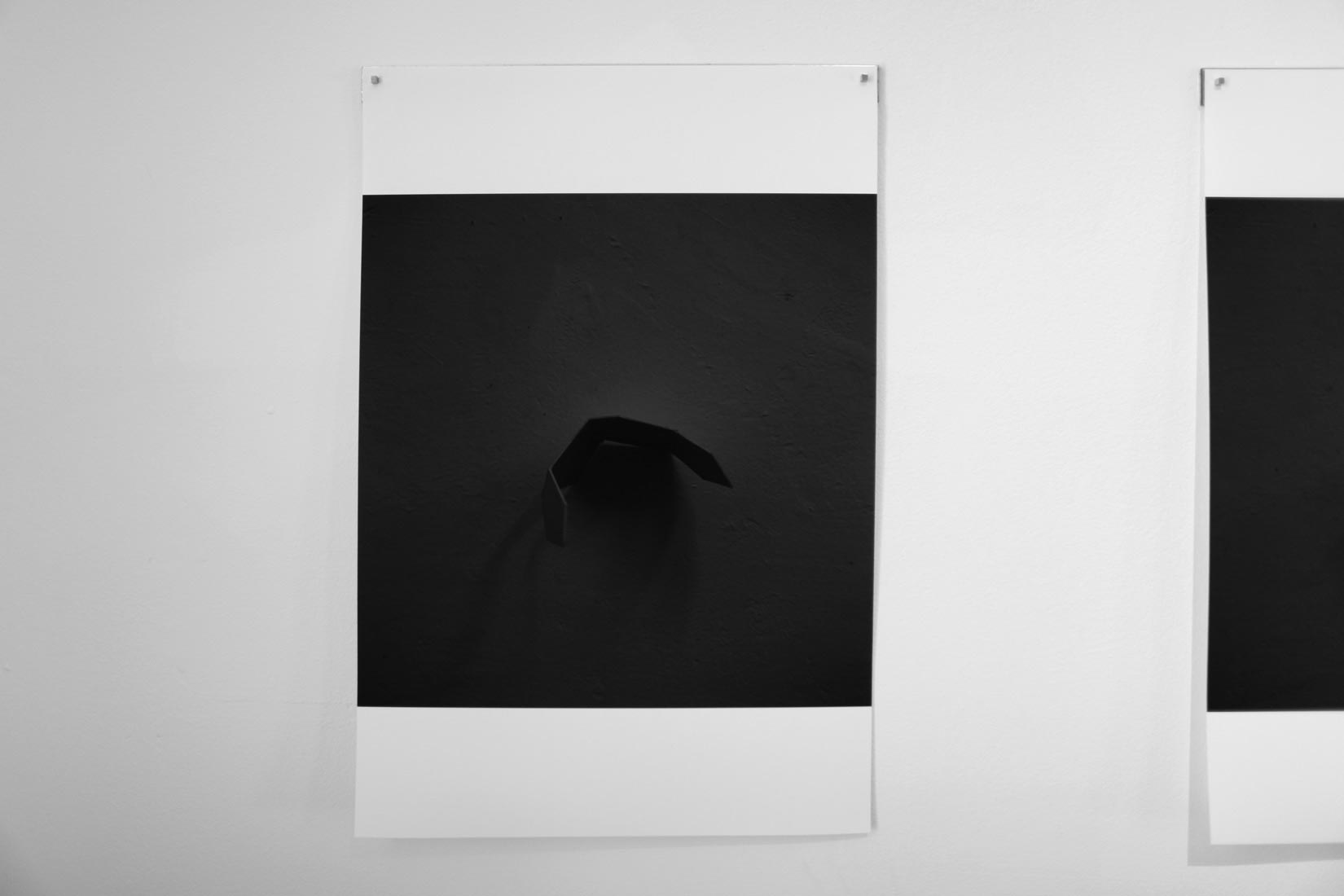 A three-dimensional model of a dodecahedron is constructed in three parts and photographed. The installation brings together the three photographs of this mystical, scientific object through the placement of the prints together in one space. The potential reconstruction takes place in the perception and experience of the viewer. The magnets reference the invisible factors which influence our lives, like cell structure and universal bonds.