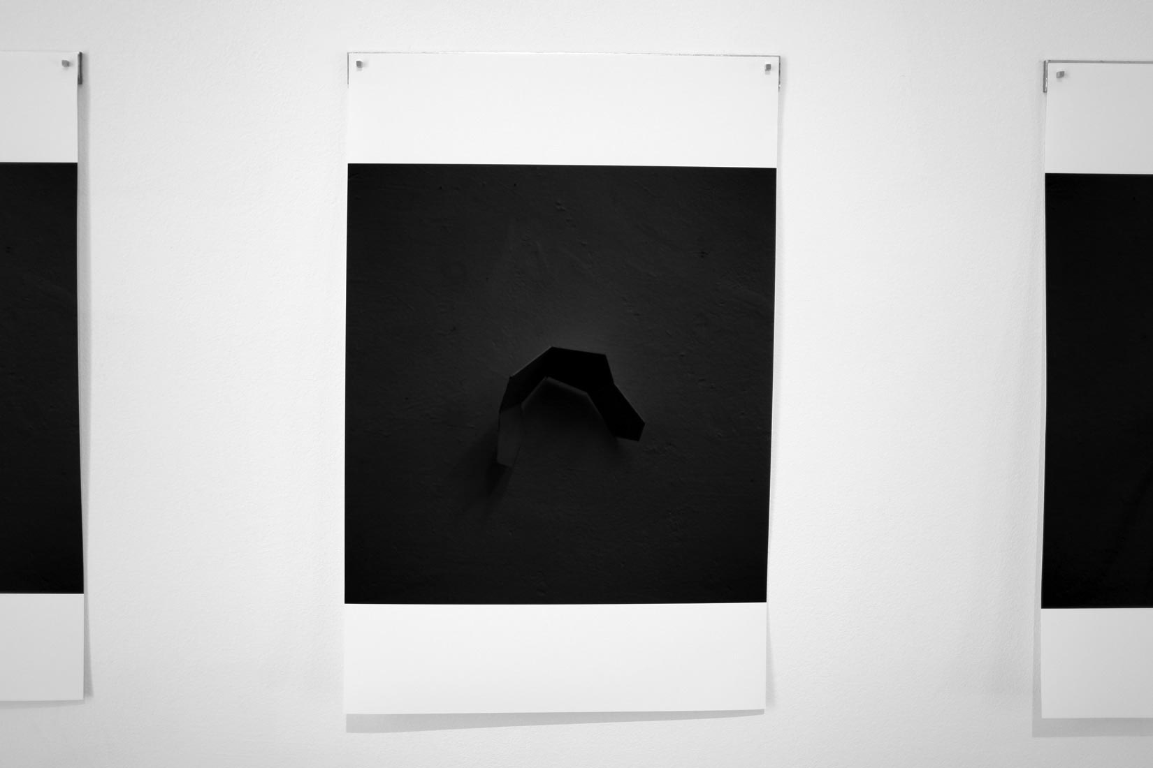 A three-dimensional model of a dodecahedron is constructed in three parts and photographed. The installation brings together the three photographs of this mystical, scientific object through the placement of the prints together in one space. The potential reconstruction takes place in the perception and experience of the viewer. The magnets reference the invisible factors which influence our lives, like cell structure and universal bonds.