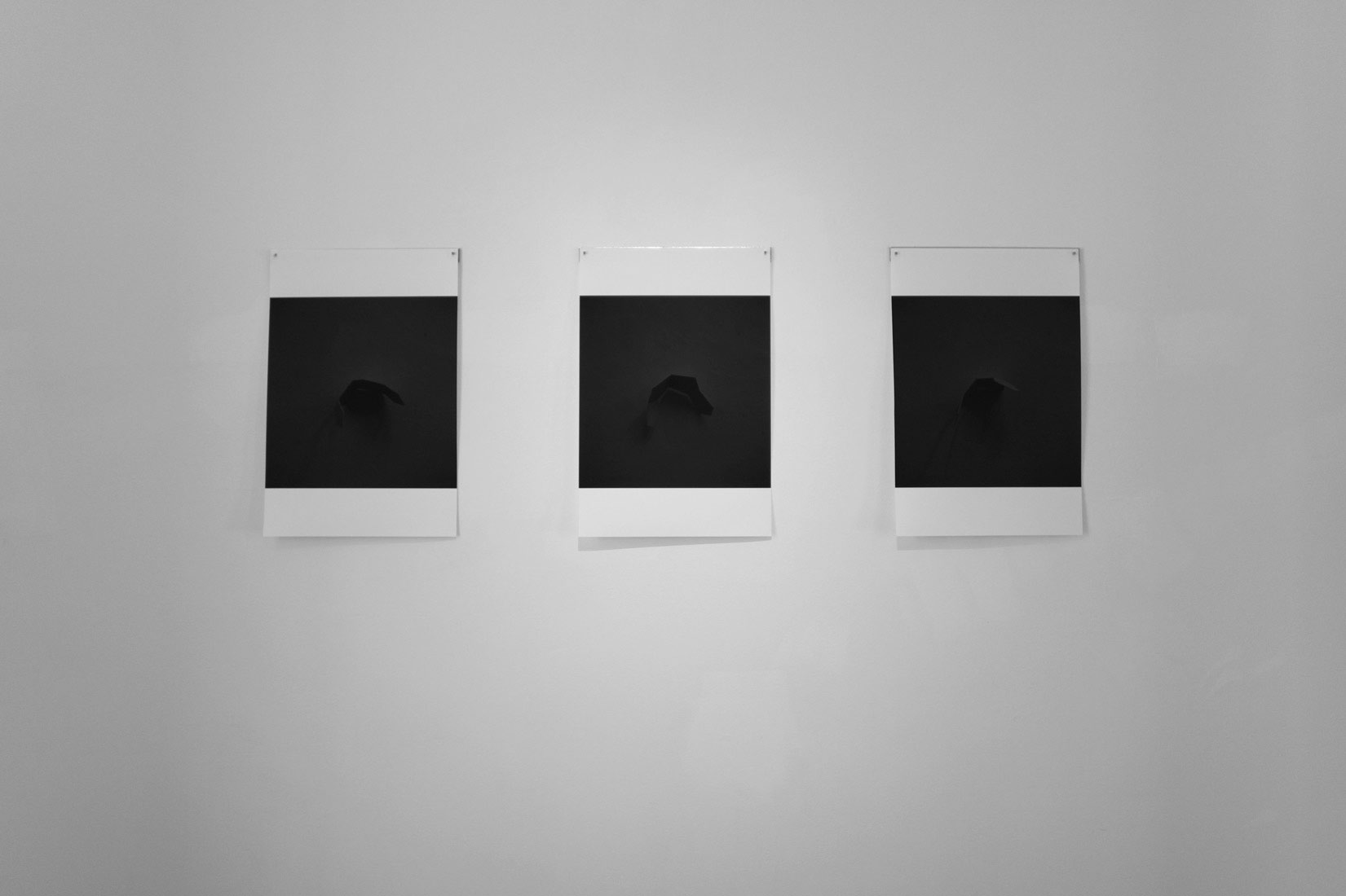 A three-dimensional model of a dodecahedron is constructed in three parts and photographed. The installation brings together the three photographs of this mystical, scientific object through the placement of the prints together in one space. The potential reconstruction takes place in the perception and experience of the viewer. The magnets reference the invisible factors which influence our lives, like cell structure and universal bonds.