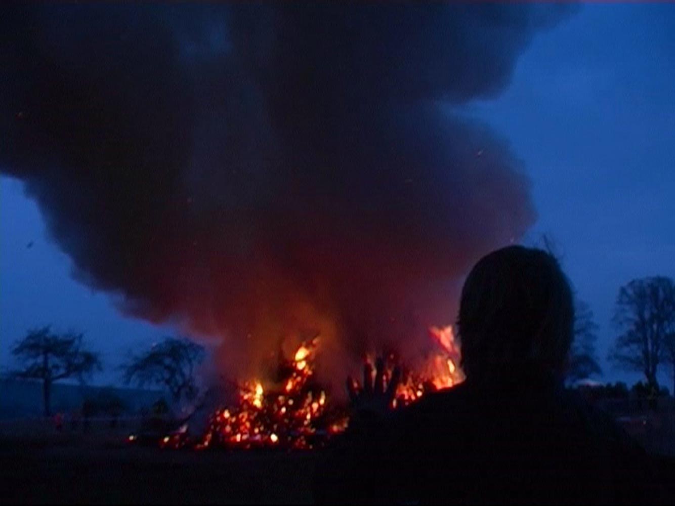 A single take of the traditional German Easter fire, silhouettes of firemen and dancing children move in slow motion across the screen as the fire increases in strength.