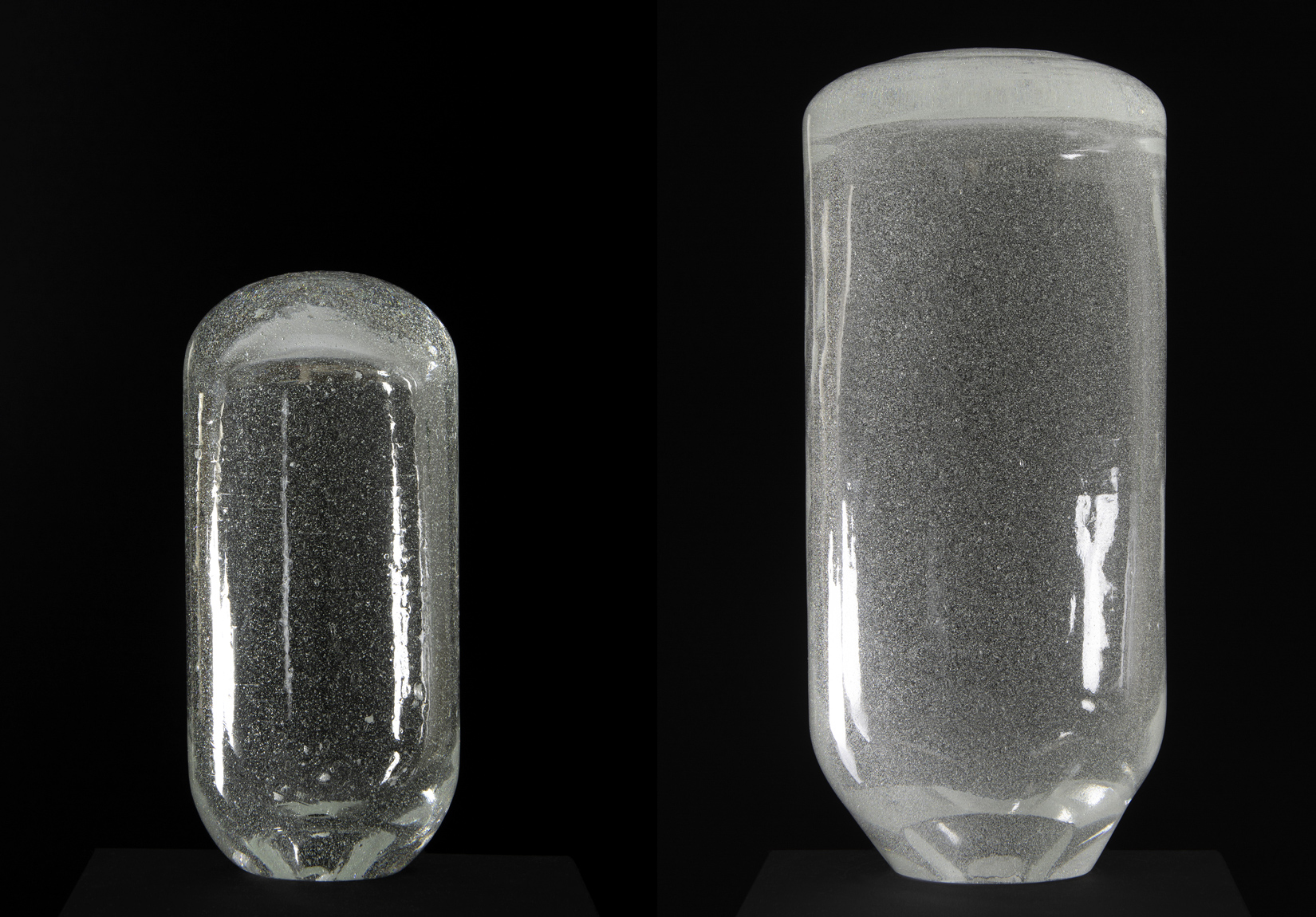 In 1954 companies that would later become BP and Total commissioned a young Jacques Cousteau to undertake an oceanographic survey of the Persian Gulf. As Cousteau's career progressed, he became a vocal conservationist. However, as a factor in the discovery of oil, the survey of 1954 was instrumental in irreversible changes in both the region and the world. Throughout 2018 and 2019, Whelan travelled to a series of coordinates from Cousteau's survey. With a dive team he conducted his own visual surveys of the sea bed. During these surveys, non-invasive sand samples were collected. Working with a master glass blower, he transformed the samples from the dive sites into glass batches. This glass was then blown into used diving cylinders, creating a series of unique objects. The form is hollow, made with human breath. This, combined with the air bubbles in the glass, evokes a sense of the fragility of life. Bubbles, particles and lines from impurities permeate the transparent medium. The remaining sand was returned to the sea.