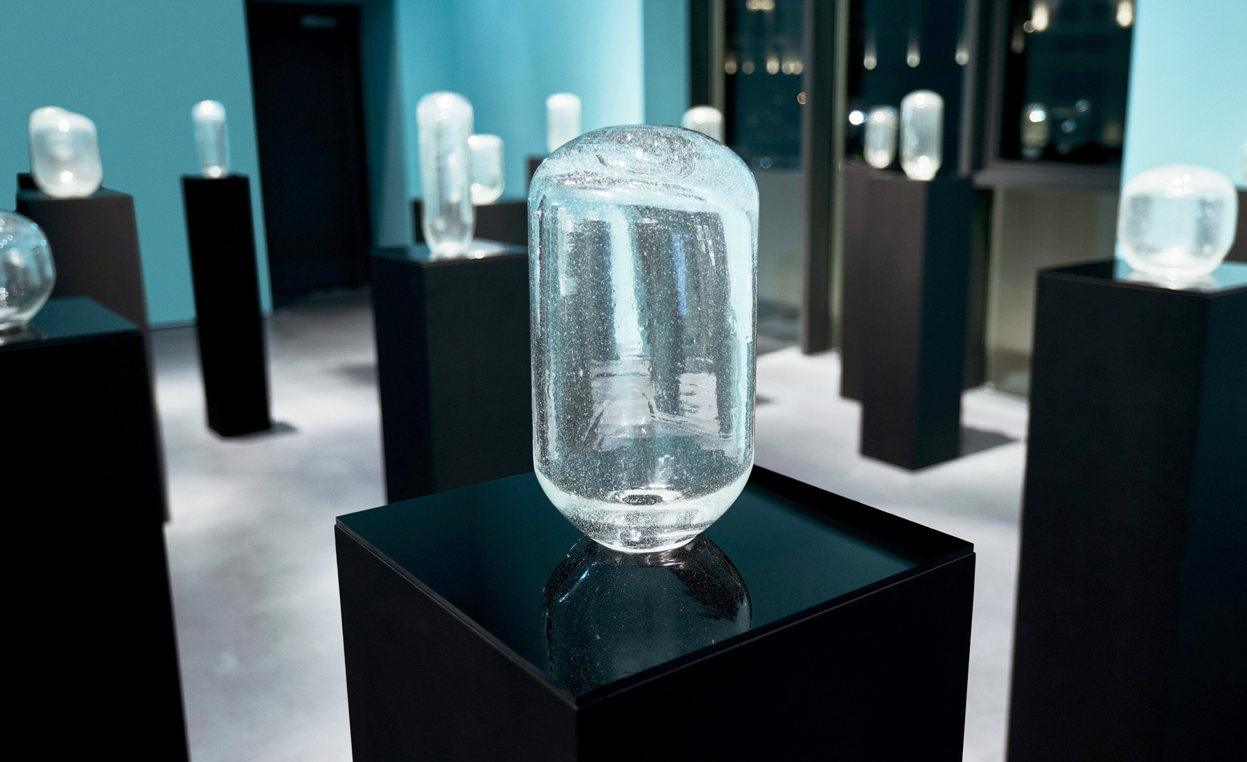 In 1954 companies that would later become BP and Total commissioned a young Jacques Cousteau to undertake an oceanographic survey of the Persian Gulf. As Cousteau's career progressed, he became a vocal conservationist. However, as a factor in the discovery of oil, the survey of 1954 was instrumental in irreversible changes in both the region and the world. Throughout 2018 and 2019, Whelan travelled to a series of coordinates from Cousteau's survey. With a dive team he conducted his own visual surveys of the sea bed. During these surveys, non-invasive sand samples were collected. Working with a master glass blower, he transformed the samples from the dive sites into glass batches. This glass was then blown into used diving cylinders, creating a series of unique objects. The form is hollow, made with human breath. This, combined with the air bubbles in the glass, evokes a sense of the fragility of life. Bubbles, particles and lines from impurities permeate the transparent medium. The remaining sand was returned to the sea.
