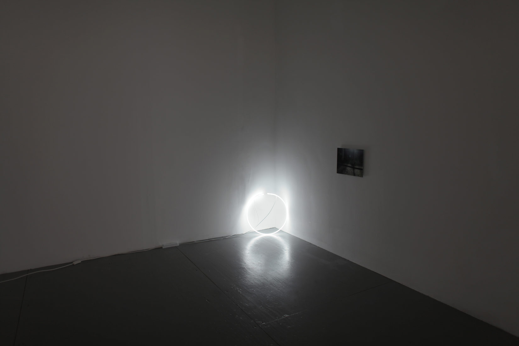 The simple shape of a circle in white neon is 'broken' at a single point on the circumference. Depending on the viewers position, the fractured object can become whole again or remain broken.