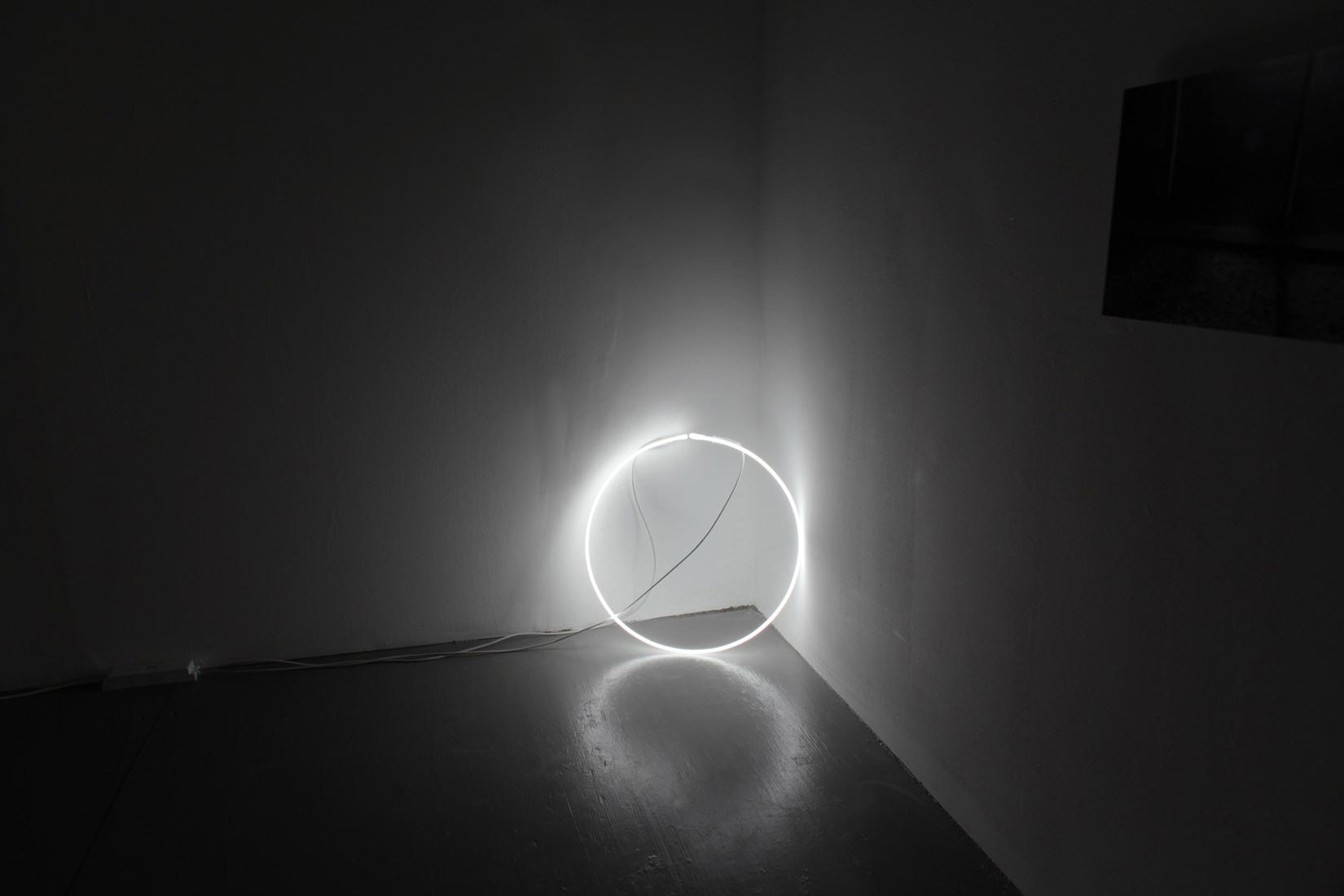 The simple shape of a circle in white neon is 'broken' at a single point on the circumference. Depending on the viewers position, the fractured object can become whole again or remain broken.