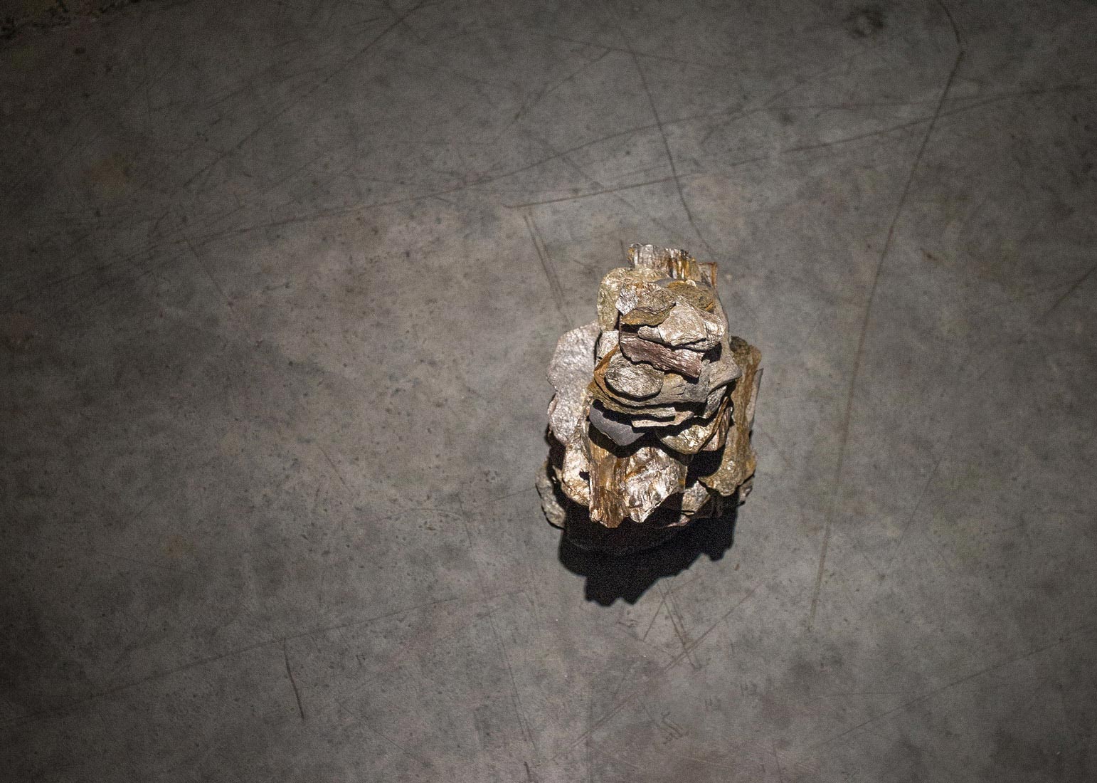 On an excursion to the mountain where the last Irish wolf was killed in 1786, Whelan collected 43 rocks from within the mountain itself. They are stacked in the form of the ancient structure of a cairn, which appears in many diverse cultures across the world. It has many functions including as landmarks and markers of burial sites. The rock structure itself is made up of crystals of graphite, sericite, chlorite and fine-grained mica which, depending on the viewers position, impart an uncanny silvery sheen from its surface.
