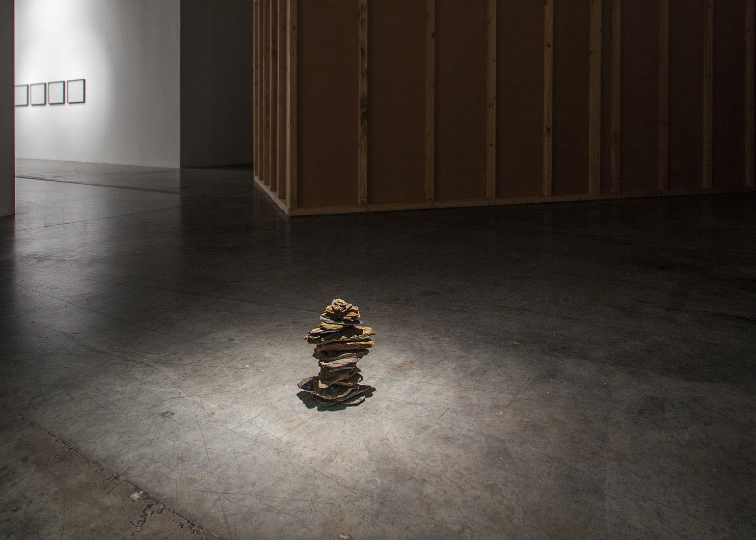 On an excursion to the mountain where the last Irish wolf was killed in 1786, Whelan collected 43 rocks from within the mountain itself. They are stacked in the form of the ancient structure of a cairn, which appears in many diverse cultures across the world. It has many functions including as landmarks and markers of burial sites. The rock structure itself is made up of crystals of graphite, sericite, chlorite and fine-grained mica which, depending on the viewers position, impart an uncanny silvery sheen from its surface.