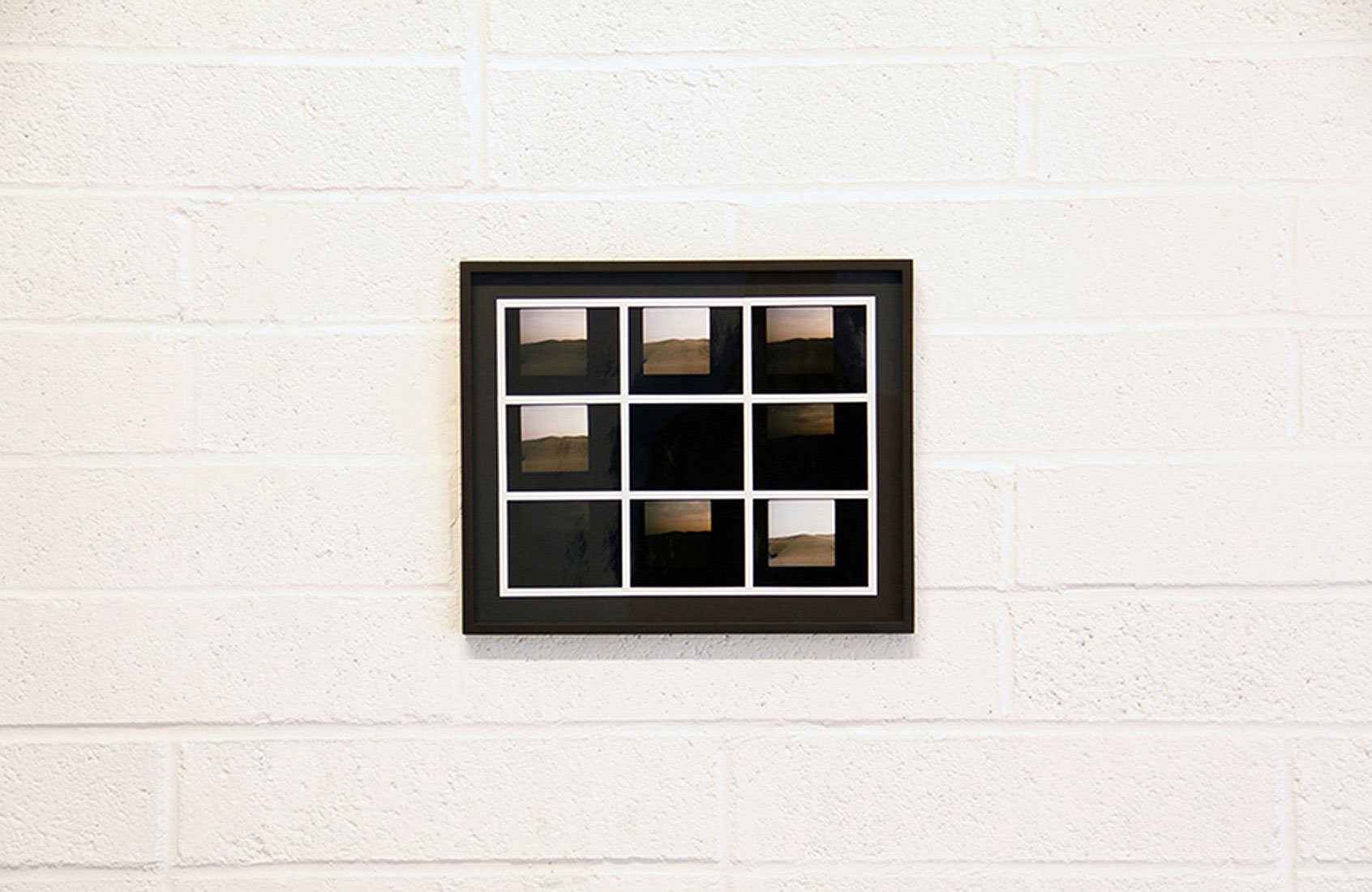 A portrait of a sand dune is recorded across nine polaroids during sunset. These are arranged randomly in the frame, fracturing the natural sequence.