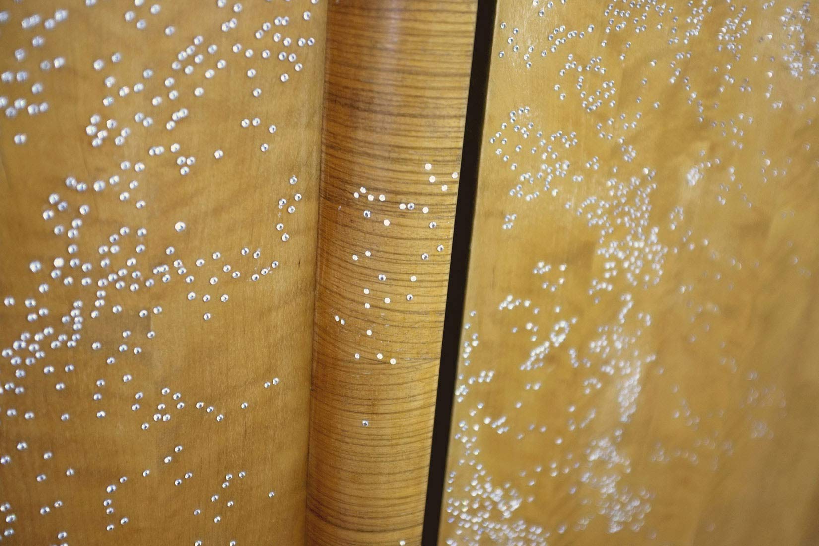 Over 9,000 fake diamonds of different diameters are embedded into the nut wood doors of a 1950's German wardrobe. The diamonds create the image of the Milky Way galaxy as it is projected to be seen from a distant position, looking back towards the Earth. The mundane domestic object is transformed by this cosmic representation, presenting a duality between the internal/domestic and the external/celestial. The title originates from the astronomical book 'Pale Blue Dot: A Vision of the Human Future in Space' by Carl Sagan, referencing both the insignificance and importance of human life on Earth.