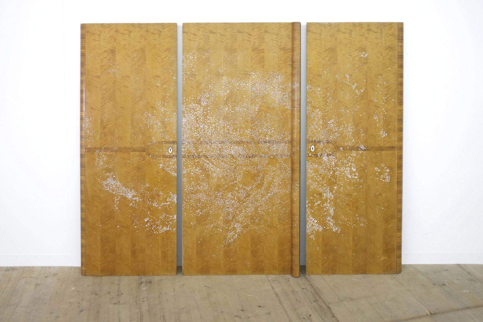 Over 9,000 fake diamonds of different diameters are embedded into the nut wood doors of a 1950's German wardrobe. The diamonds create the image of the Milky Way galaxy as it is projected to be seen from a distant position, looking back towards the Earth. The mundane domestic object is transformed by this cosmic representation, presenting a duality between the internal/domestic and the external/celestial. The title originates from the astronomical book 'Pale Blue Dot: A Vision of the Human Future in Space' by Carl Sagan, referencing both the insignificance and importance of human life on Earth.