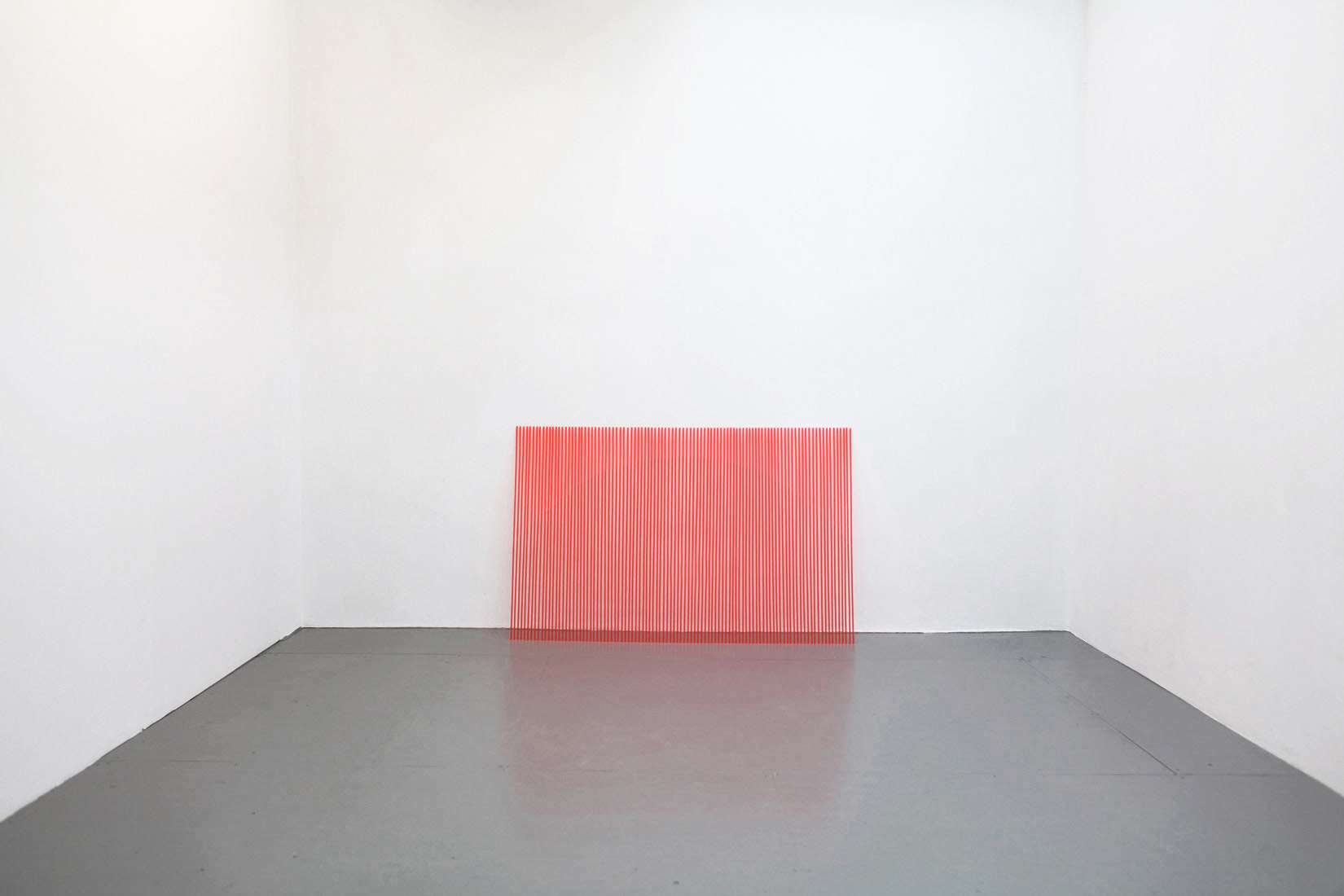 This work begins with a pristine material which is altered through sanding, creating a refraction of light. This results in the image of a partial circle, or rising sun. It exists on the edge of visibility, fractured, but also supported by the material nature of the plastic.
