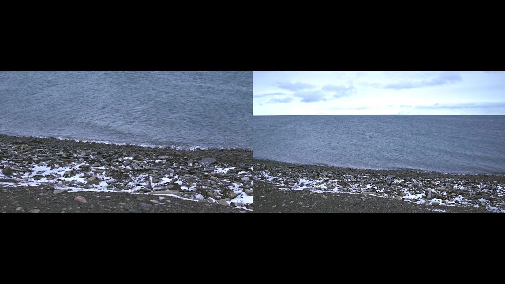 This work takes as a starting point the appearance of a white humpback whale off the coast of the Arctic archipelago Svalbard in 2012. A fractured narrative is constructed across two screens intertwining and juxtaposing both found and originally created footage. The found footage consists of dozens of digitally recorded albino appearances of animals from all over the world, distorted visually to the edge of abstraction. The originally filmed footage is of different parts of the coastline of Svalbard, facing the Arctic Ocean. Both visual positions appose the unseen and the recorded, the absent and the digitally present. Using this imagery in combination with subtitles and sound, Frontier explores albinism as a genetic phenomenon and an attraction often resulting in abuse and ritual persecution. The subtitles originate from three sources: testimonies from Tanzanian and Malawian albinos, scientific studies into the relationship between radiation from Chernobyl and the increase in albinism in birds, and the original dialogues in the background of the found footage from the internet.