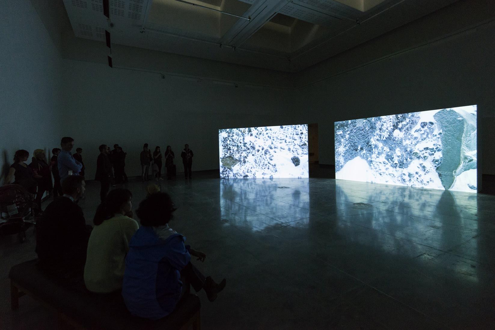 This work takes as a starting point the appearance of a white humpback whale off the coast of the Arctic archipelago Svalbard in 2012. A fractured narrative is constructed across two screens intertwining and juxtaposing both found and originally created footage. The found footage consists of dozens of digitally recorded albino appearances of animals from all over the world, distorted visually to the edge of abstraction. The originally filmed footage is of different parts of the coastline of Svalbard, facing the Arctic Ocean. Both visual positions appose the unseen and the recorded, the absent and the digitally present. Using this imagery in combination with subtitles and sound, Frontier explores albinism as a genetic phenomenon and an attraction often resulting in abuse and ritual persecution. The subtitles originate from three sources: testimonies from Tanzanian and Malawian albinos, scientific studies into the relationship between radiation from Chernobyl and the increase in albinism in birds, and the original dialogues in the background of the found footage from the internet.