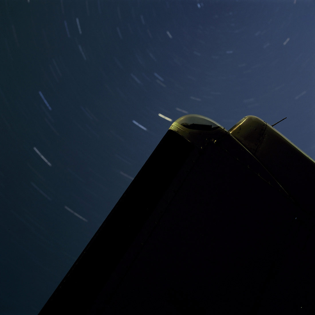 Three analogue photographs present dark abstract shapes set against long exposures of the night sky. Upon closer investigation the shapes are revealed to be details of the wings of an ATR-42 passenger aircraft. The distant background contrasts the immediacy of these man-made objects which reference ideas of modernity and globalisation.