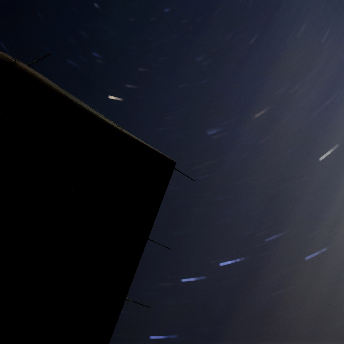 Three analogue photographs present dark abstract shapes set against long exposures of the night sky. Upon closer investigation the shapes are revealed to be details of the wings of an ATR-42 passenger aircraft. The distant background contrasts the immediacy of these man-made objects which reference ideas of modernity and globalisation.