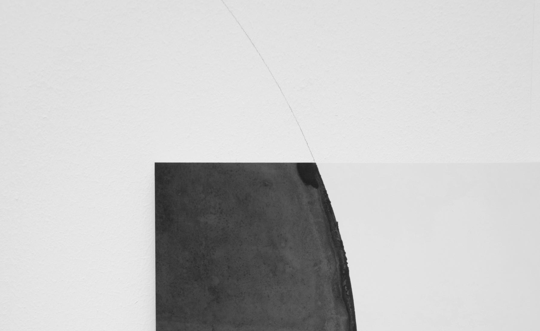 Two photographs of a concrete structure are hung apart from each other. Composition and placement allows the curvature of the structure to create two sections of a circle. The remainder of the circle is completed by hand with pencil directly on the wall. The transient and impermanence of the pencil line is placed in contrast to the permanence of this architectural construction, who's massive scale is evident only from the size of a seagull present in one of the photos. |