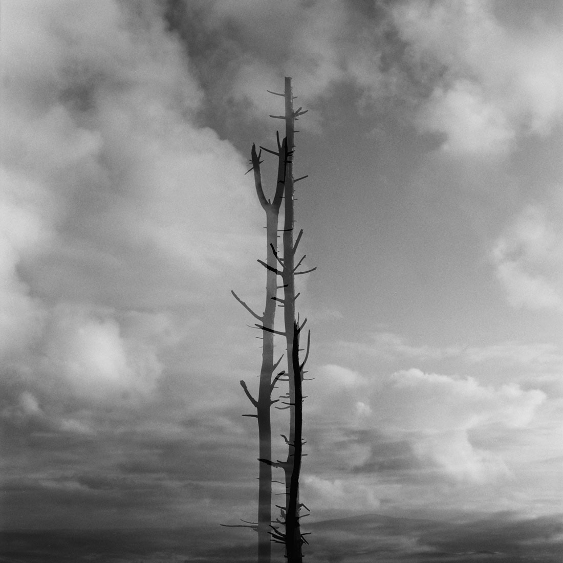 A view from this mountain of dead trees is recorded through an analogue multiple exposure, made on site within the camera. As the translucent layers of the multiple exposure cross and build up presence on the surface of the film, a small area becomes more defined and properly exposed. Some form of presence arises from the ephemerally absent.