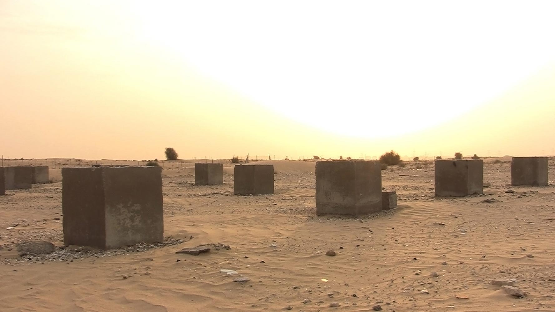 A sunset is recorded in a single take, with concrete sculptural forms as the subject in the foreground. These structures are forgotten foundations of an abandoned building on the edge of Dubai, directly where the city meets the desert. They are overlooked contemporary archaeological relics of a hyper expansion. Using digital time manipulation and editing techniques, the sun in the video both sets and rises in a seamless loop. The viewers experience is no longer real time but rather a manufactured durational experience. |