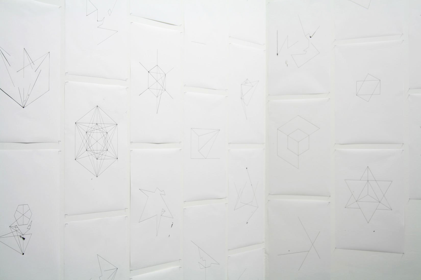 This project represents a desire to understand a complex geometric shape. The repetitive act of making one drawing after another of this shape becomes a physical attempt to understand and in a way control the form. Through the exhibiting of multiple versions within an ordered installation, the sense of control and understanding achieved by the artist is offered to the viewer. Any interactions between paper, ruler and ink are recorded as drops, smudges and bleeding. |
