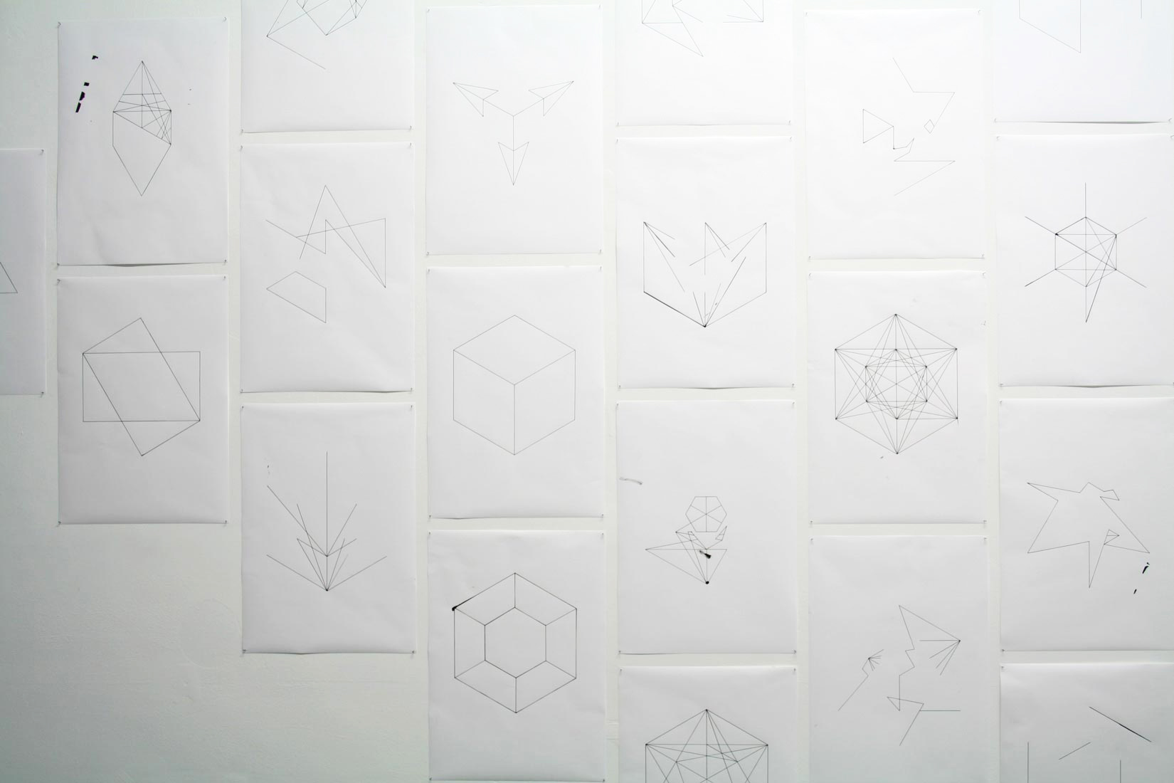 This project represents a desire to understand a complex geometric shape. The repetitive act of making one drawing after another of this shape becomes a physical attempt to understand and in a way control the form. Through the exhibiting of multiple versions within an ordered installation, the sense of control and understanding achieved by the artist is offered to the viewer. Any interactions between paper, ruler and ink are recorded as drops, smudges and bleeding. |