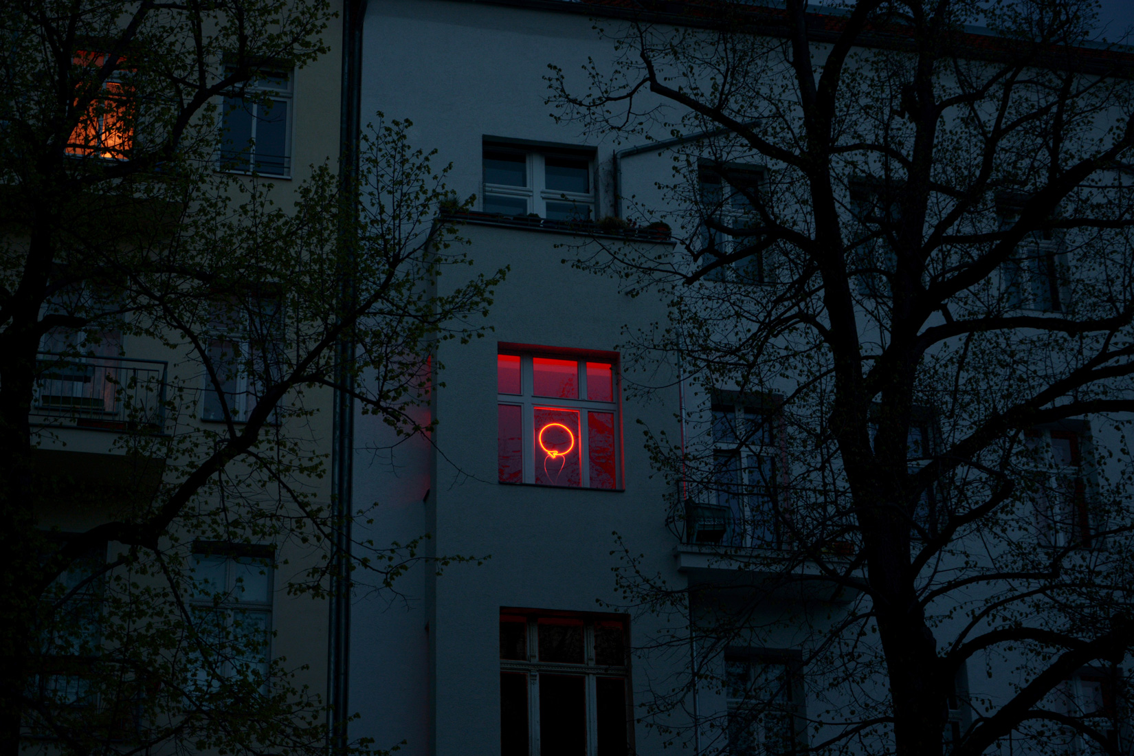Depicting a serpent eating its own tail, the ancient symbol ouroboros is constructed in red neon. It flashes 24 hours a day for the duration of the exhibition and is often installed in a public location facing the street. The exact timing of the flashing is sourced from footage of the earliest neon signs. The constancy of the flashing resonates with the cyclicality that the symbol represents.