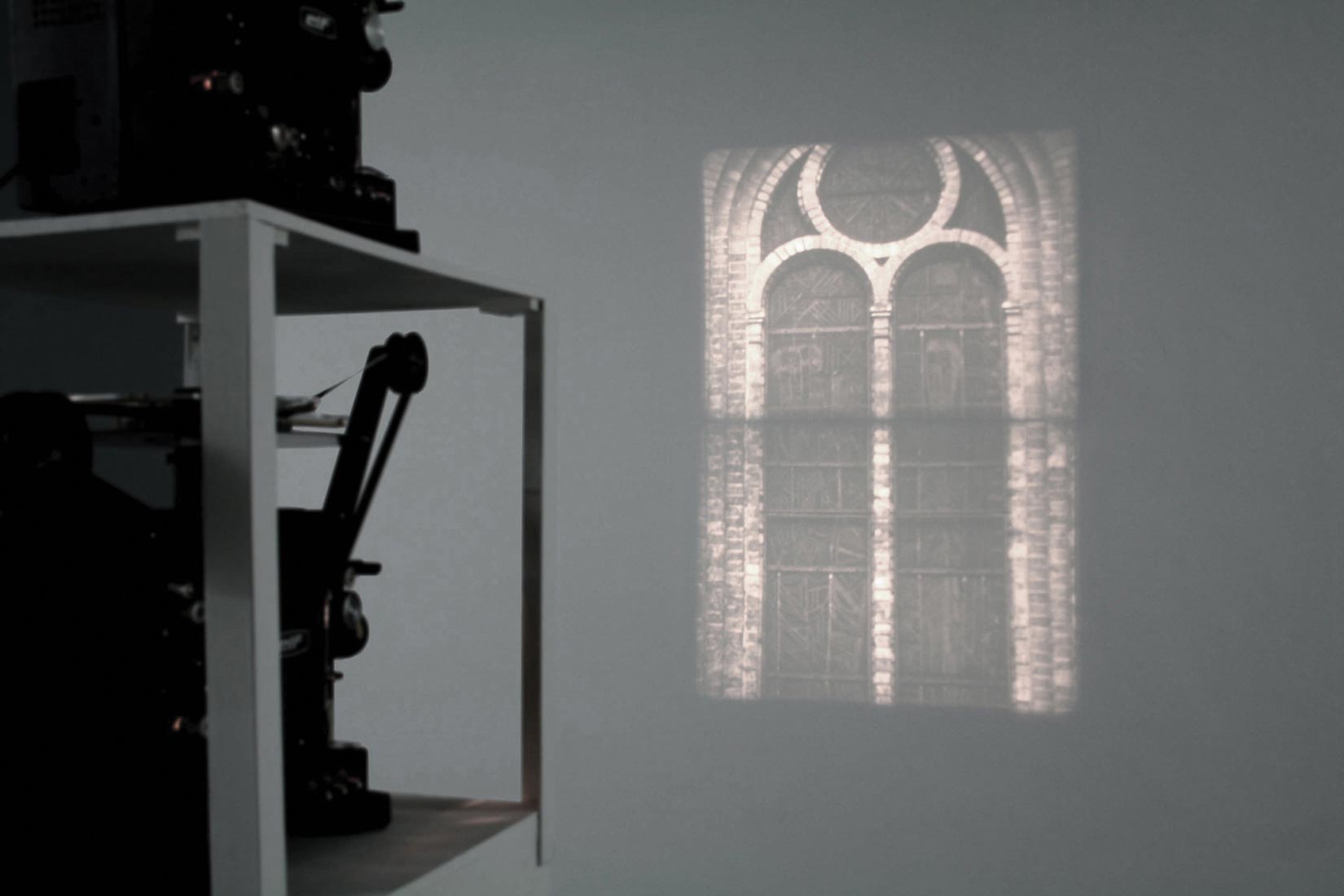 An image of a stained glass church window is de- and re-constructed across two projections. Filmed from the outside with the interior church lights off, the pictorial effect of the stained glass is rendered ineffective. The stillness of these images is broken only by the chaotic flurries of snowflakes between the camera and the window. |