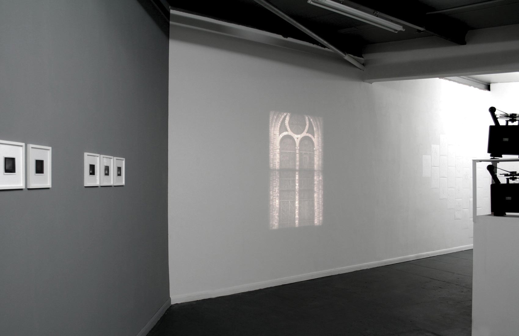 An image of a stained glass church window is de- and re-constructed across two projections. Filmed from the outside with the interior church lights off, the pictorial effect of the stained glass is rendered ineffective. The stillness of these images is broken only by the chaotic flurries of snowflakes between the camera and the window.