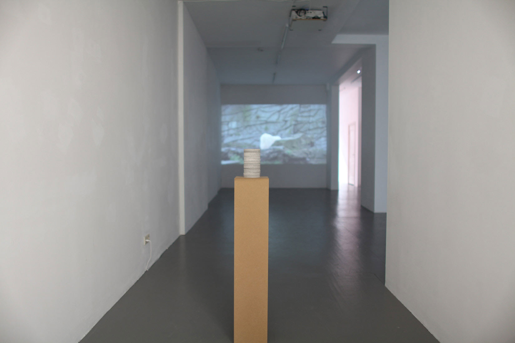 The geometric form of a circle is cut out repeatedly from four copies of 'Finnegans Wake' by James Joyce. The notion of cyclicality referenced in the 1939 book is here transferred into a geometric form that runs through the books. The pages are removed from their correct order and stacked simply on a raw wooden plinth. The concept of the cycle expressed in this book is translated into the physical form of the circle and then the column. The pages become a monument to fractured materials and ideas.