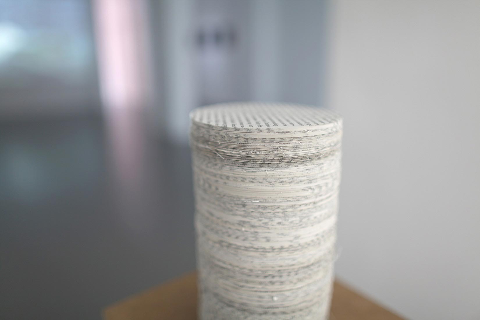 The geometric form of a circle is cut out repeatedly from four copies of 'Finnegans Wake' by James Joyce. The notion of cyclicality referenced in the 1939 book is here transferred into a geometric form that runs through the books. The pages are removed from their correct order and stacked simply on a raw wooden plinth. The concept of the cycle expressed in this book is translated into the physical form of the circle and then the column. The pages become a monument to fractured materials and ideas. |