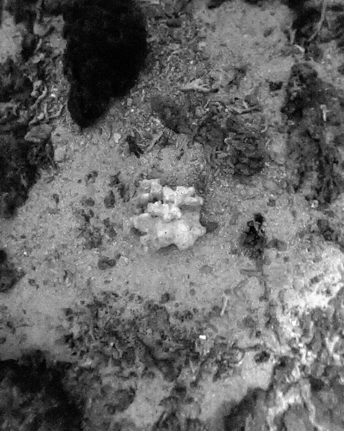 A dive boat travelled 110km into the Persian Gulf from Dubai. On board with a diver and Whelan was a found piece of pillar coral, wrapped in burial cloth. The boat travelled to a site where oil surveys and geological extractions took place for over half a century. They waited for the sun to set. Once it was completely dark, the diver dropped into the depths with only a torch and the coral. She descended over twenty meters. Once she reached the traumatised seabed, she gently placed the coral down in an empty area. A photo was taken of this votive offering as she ascended, using her torch as illumination. This photo is exhibited alongside the cloth that the coral was wrapped in during its journey.