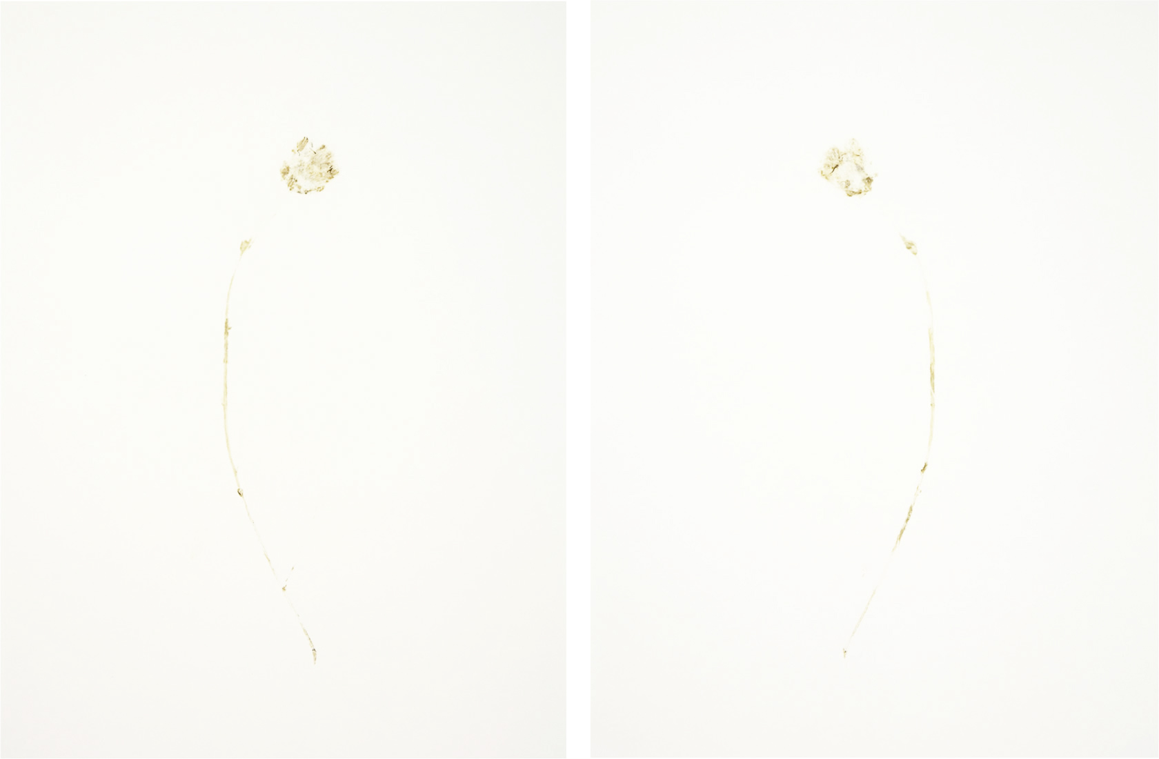 Irish wild flowers were collected from the mountain where the last Irish wolf was killed in 1786. The flowers were then pressed. Unlike with traditional flower pressing methods, the flower itself was discarded. All that remains are ephemeral traces on the two sheets of paper that were used to press the flowers.